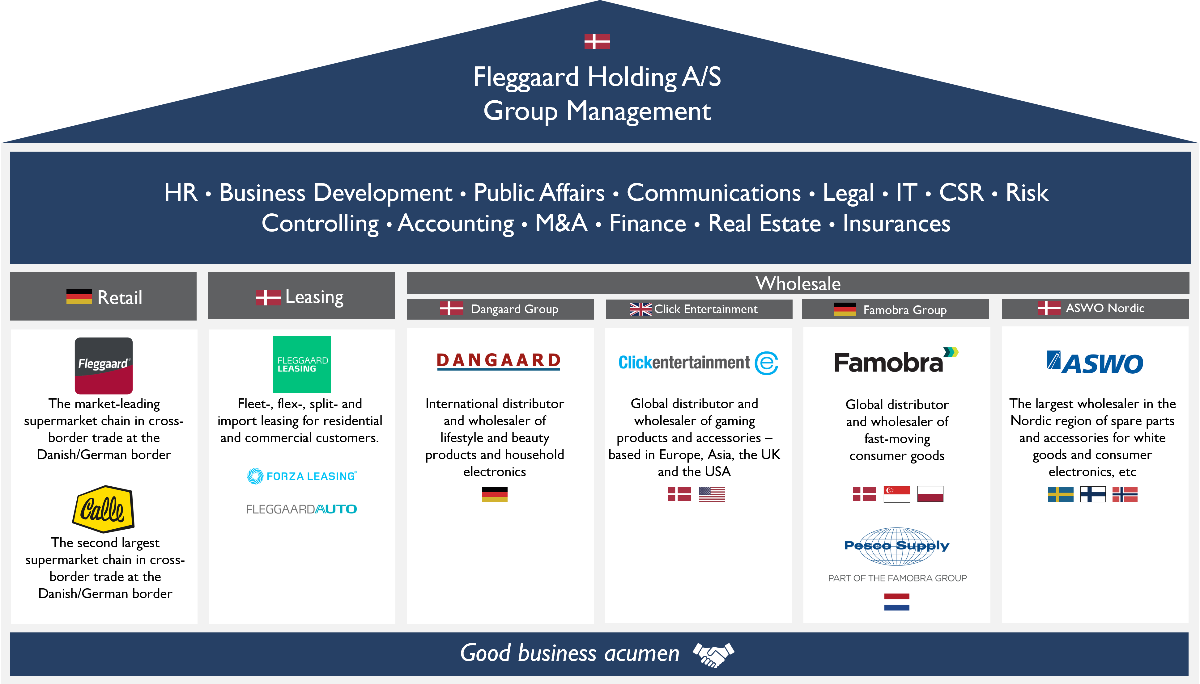 Through the years, the Fleggaard Group has had a strategic focus on spreading group activities across various industries that serve different segments and markets.Today, Fleggaard is one of Denmark's largest family-owned groups with an annual turnover of approx. 935m Euros and about 1.600 employees distributed among 10 companies. The activities and business areas of the group cover a wide field, but are concentrated in three core areas retail, wholesale and car leasing.